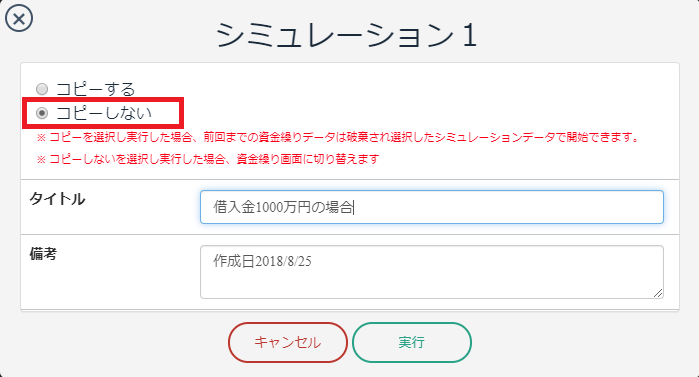 この状態で、入金情報や借入情報を登録・変更すると、その変更は該当シミュレーションに対して行われます